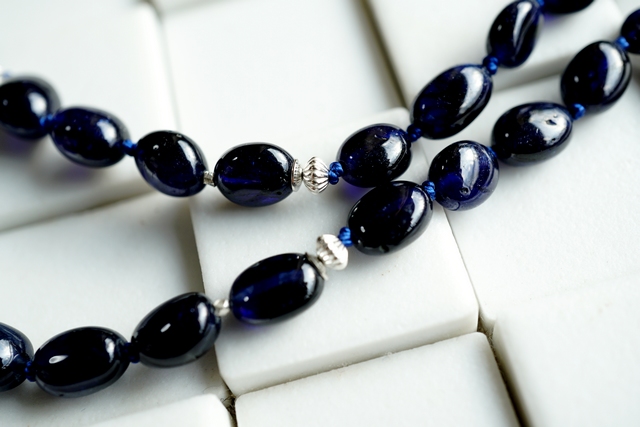 アフリカ産の美しいサファイアをシルク糸でつなげていったネックレスです。