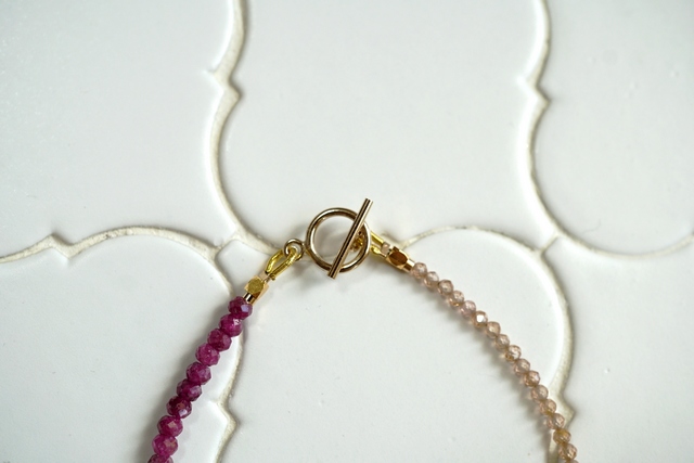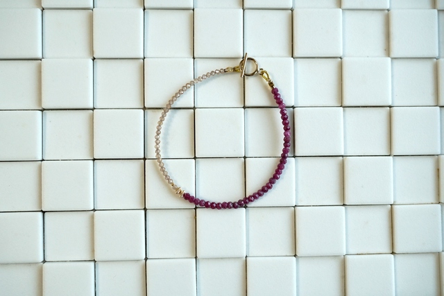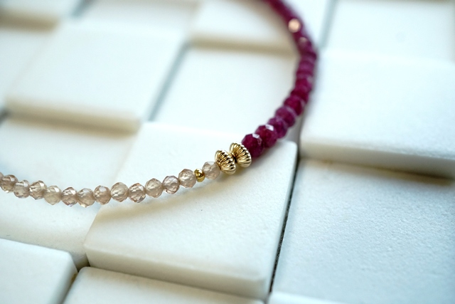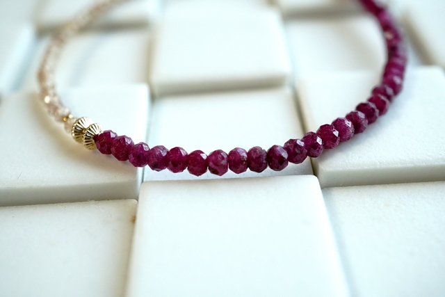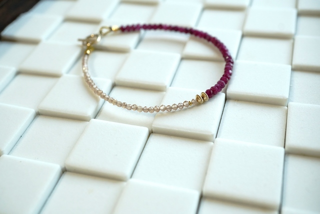 マダガスカル産の宝石質・天然ジルコンとルビーをソフトタイプのワイヤーに通してつないでいったブレスレットです。