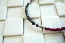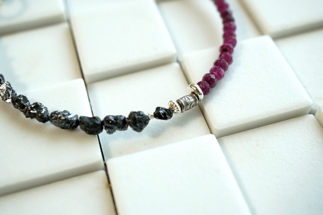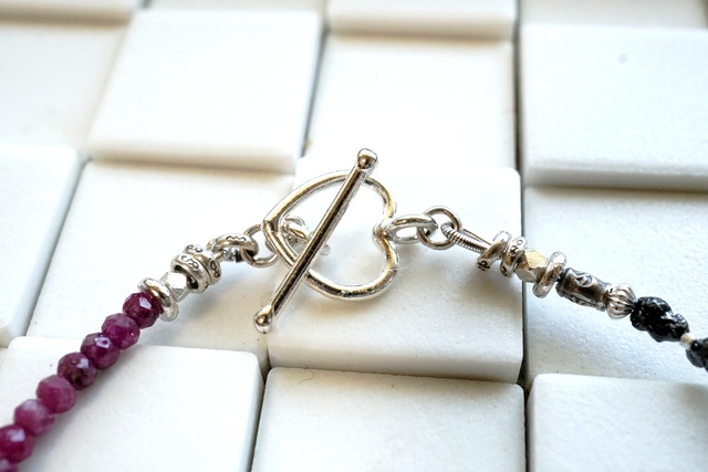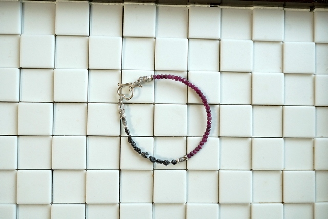 黒と濃いピンクの美しいお色のコンビネーションをお楽しみいただけましたらうれしいです。大人の女性にぴったりな組み合わせではないでしょうか。手の動きとともに手首の石たちが光を受けてきらきらと輝きます。そんな美しい石たちを見るたびににんまりしていただけるのではないでしょうか。