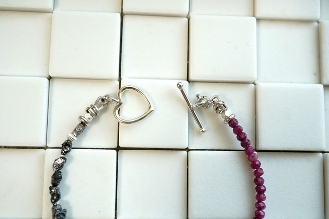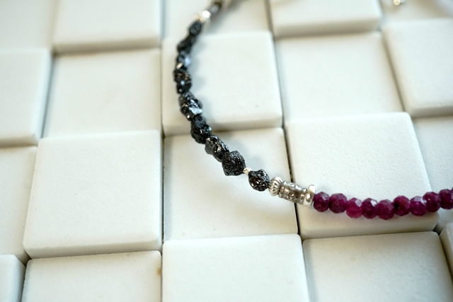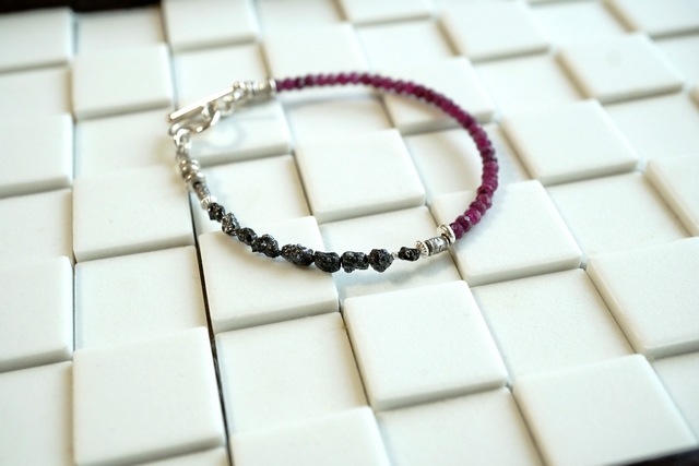 マダガスカル産の宝石質・天然ジルコンとブラックダイヤモンド(ラフタンブル)をソフトタイプのワイヤーに通してつないでいったブレスレットです。