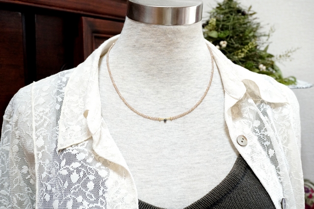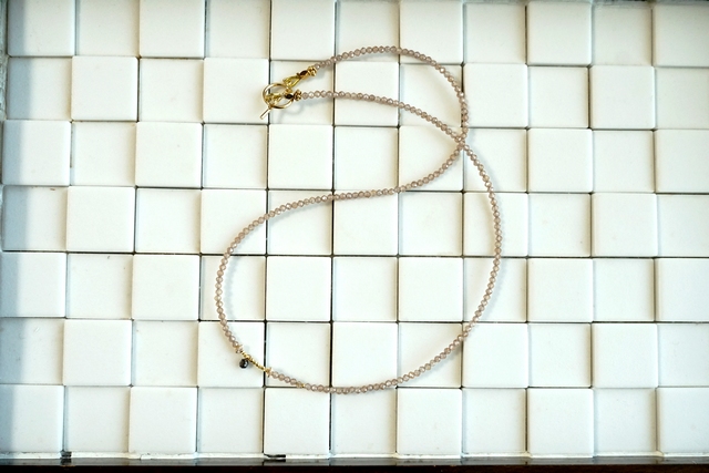 ネックレス部分には宝石質の美しいベージュの天然ジルコンを使いました。とても細かい2mm玉、カットがほどこされていますので、実寸よりさらに小さく見えるかと思います。チェーン感覚でおつけいただけます。