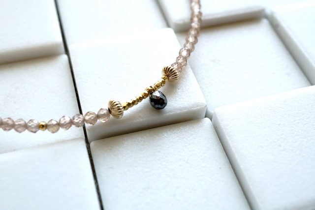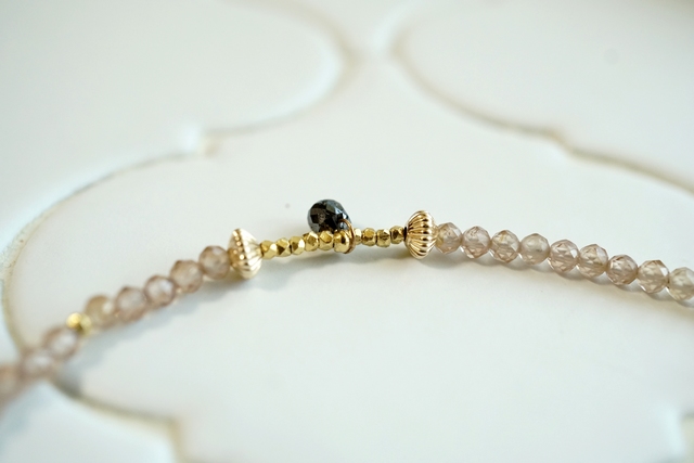 小さなブラックダイヤモンドはネックレス中央、1ミリ程度の小さなゴールドビーズを並べた個所に下げてあります。ネックレスは全体がゴールドと薄ベージュのお色目で、とても美しい佇まいかと思います。
