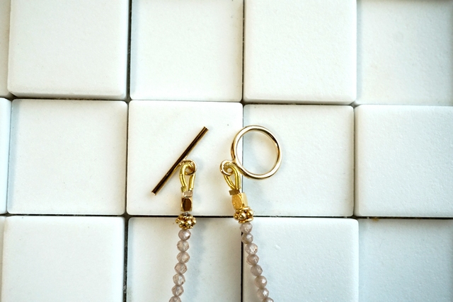 留め金はK14ゴールドフィルドのシンプルなわっかマンテルです。慣れてしまうと着脱がとても楽で、すっきりとした見た目も美しい留め金です。