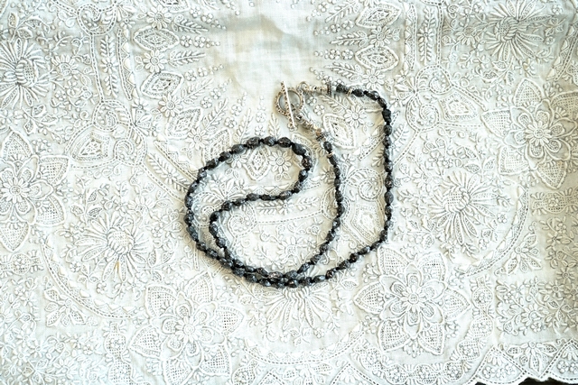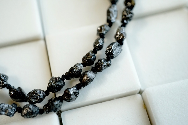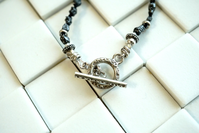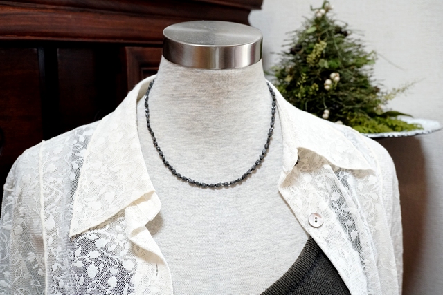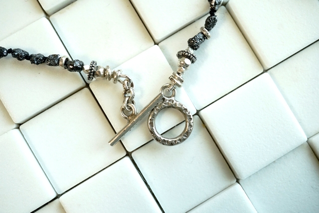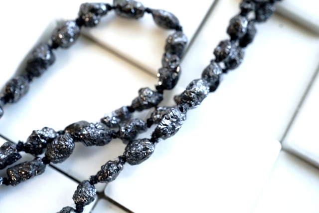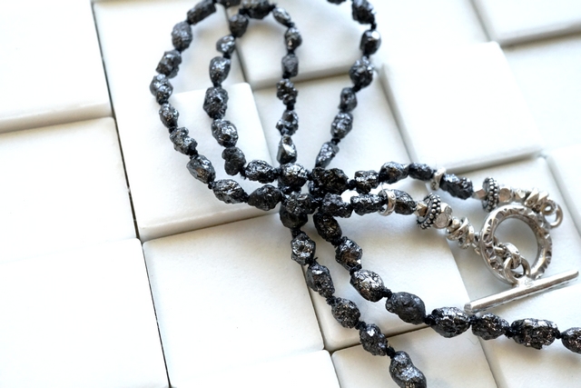 小さな小さなブラックダイヤモンド(ラフロック)をシルク糸で結びながらつなげていったネックレスです。石はひとつひとつが形も大きさも微妙に違っているんです。大きいもので長さ6ミリ程度、小さい石は4ミリくらいのサイズです。