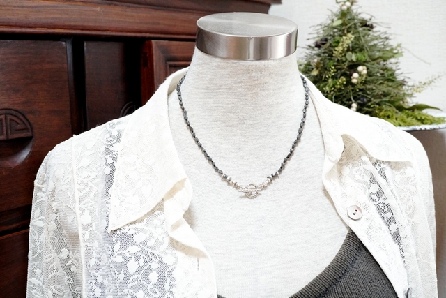 留め金を前面中央に出しておつけいただくと、アクセントのあるネックレスになりますね♪