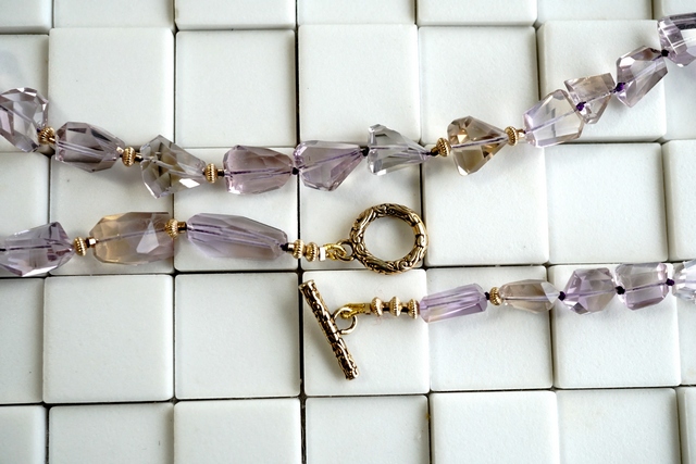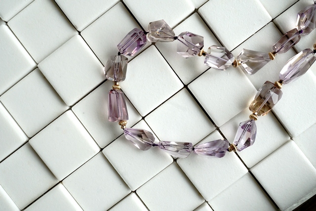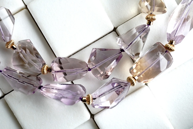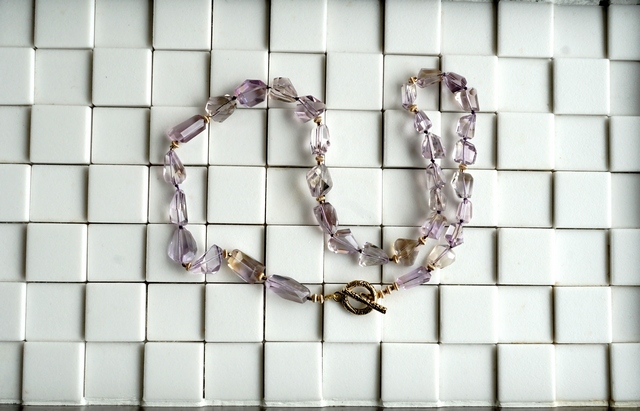 アメトリンはアメジストの紫とシトリンの黄色のバイカラーが魅力的な石、こちらは宝石質の美しいアメトリンをシルク糸でつないでいったネックレスです。
