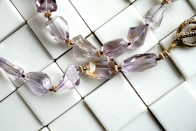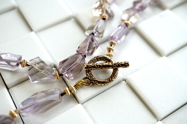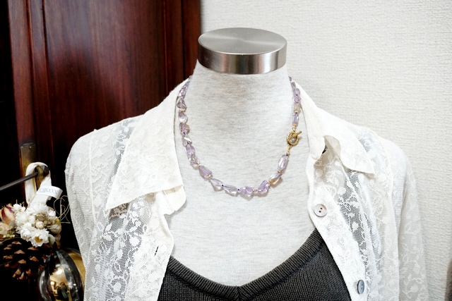 こちらの石は、石だけで十分見ごたえあるネックレスですが、ところどころ、アクセント程度に深いゴールドが美しい大人なビーズを挟んでいます。