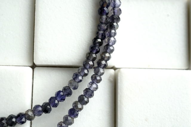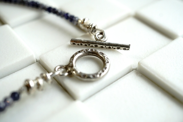 また今回使用したアイオライトは細かい粒の石ですので、チェーン感覚でおつけいただけるかと思います。その小さな石1粒1粒にカットが施されており、光を受けてきらきらと美しくその美しさもお楽しみいただけます。