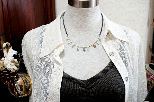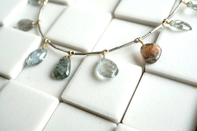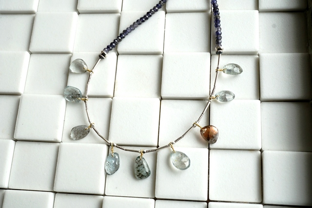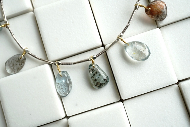 ネックレスの前面半分はこのモスアクアマリンとシルバーチューブ、横から後ろにかけてはアイオライト(3mmボタンカット型)を使用しています。スモーキーな色合いの石たちが控えめながら美しく散りばめられたネックレスです。